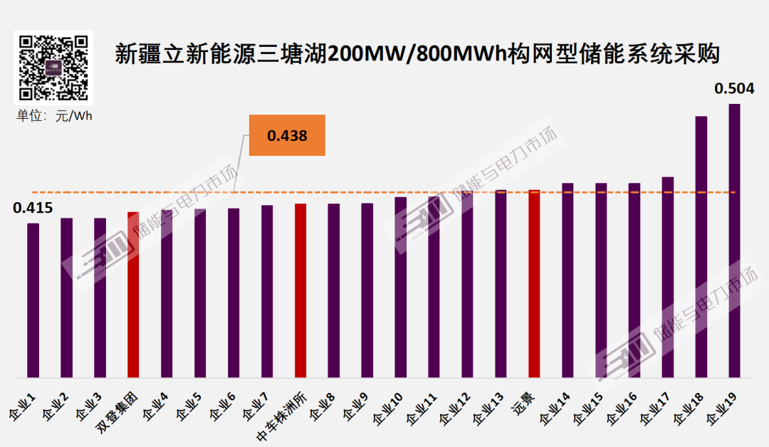 ]article_adlist-->开标数据显示,该项目共22家企业参与报价,报价范围0.415~0.504元/Wh,平均报价0.438元/Wh,其中: