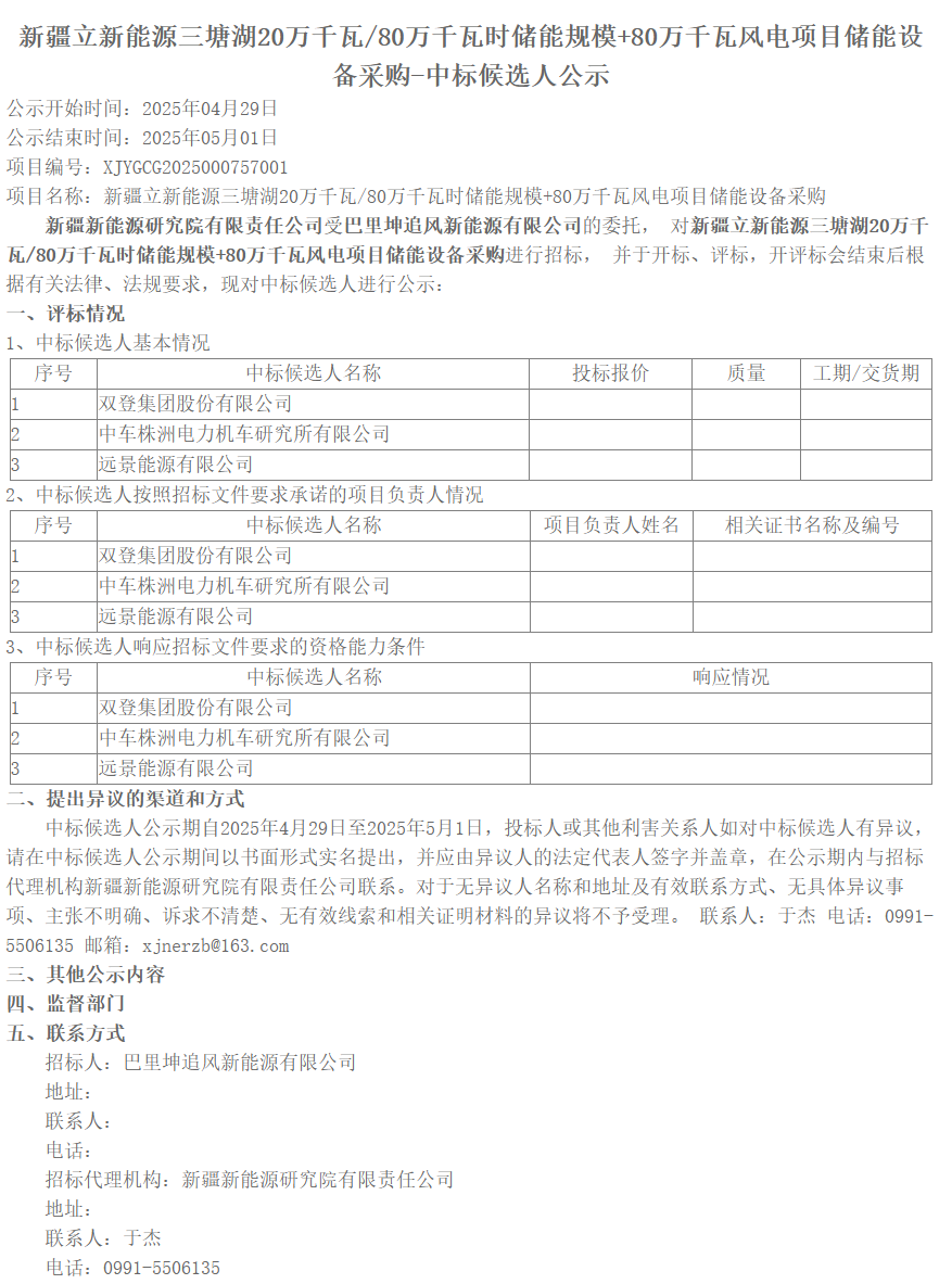 招标文章可参考:200MW/800MWh构网型,新疆立新能源储能设备采购 ]article_adlist-->中标候选人公示原文如下: